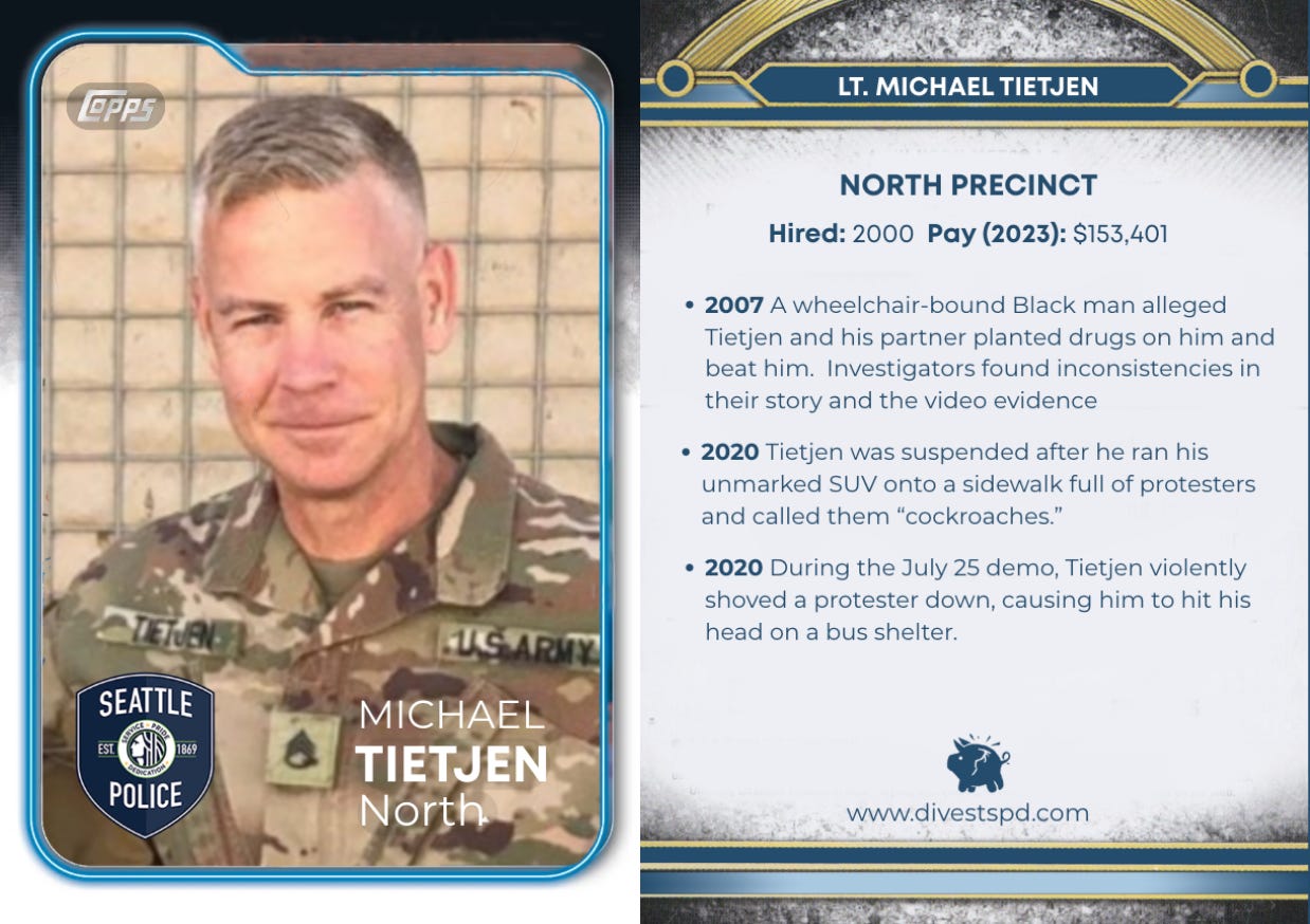 Tietjen racked up the most complaints in the 2020 protests, including one for trying to hit protesters on the sidewalk with his SUV. SPD rewarded him with a promotion.