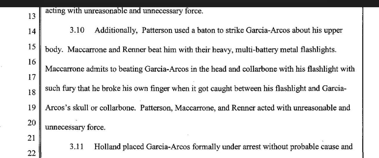 Hitting him with fists, batons, and flashlights, the officers broke Garcia-Arcos’ vertebrae, ribs, and nose, then charged him with assaulting an officer. The charges were later dropped.