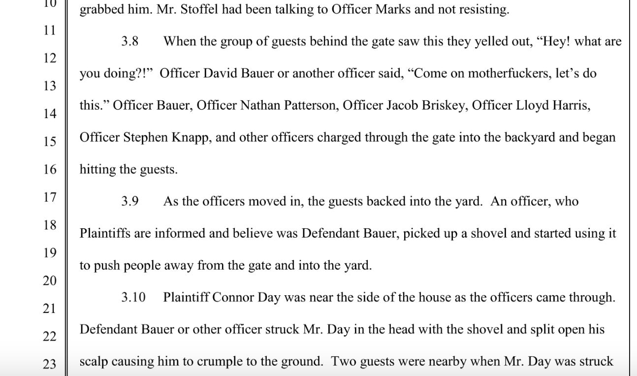 According to the lawsuit, Patterson and other officers handcuffed one of the partygoers on the ground. They repeatedly punched and hit him with batons. Patterson would later brag on camera that he broke his nightstick during this incident.