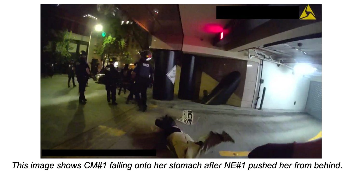 Another officer pushed her from the side, and she spun all the way around. Christensen then planted his feet, bent his elbows and pushed her into the remnants of a barricade. She tripped and fell.