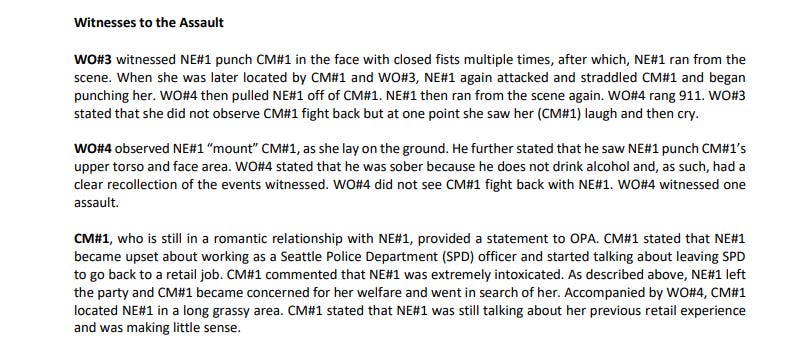 Witnesses say Lopez-Ojeda was “extremely intoxicated” that evening and was contemplating leaving SPD to return to retail work. The OPA report describes a “heated verbal argument” between Lopez-Ojeda and the victim, who is also an SPD officer.