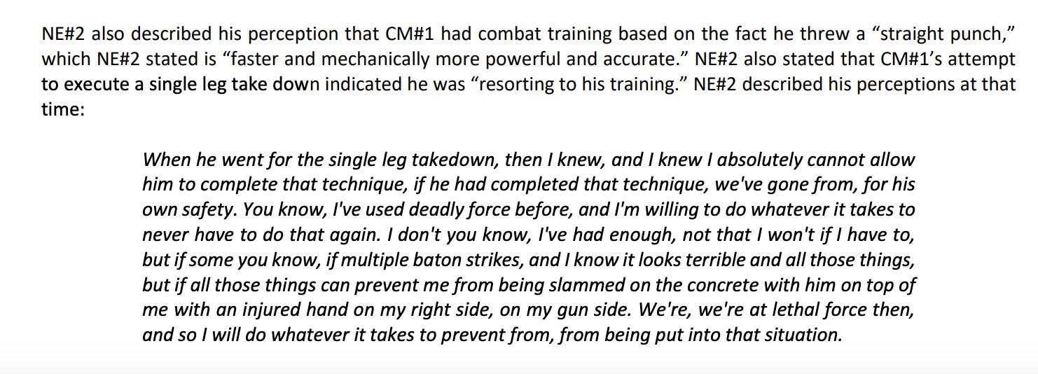 This is a theme. Throughout the report, the OPA defers to the officer’s perceptions of events where there isn’t clear video evidence. Later, when describing a portion of the video where the man grabs Patterson’s leg, the OPA notes again that it isn’t “fully visualized” but that both officers believed he was attempting a “single-leg takedown.”