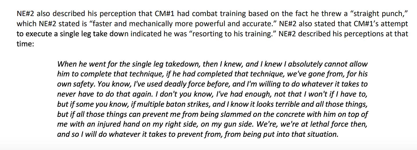 Together, the alleged “punch” and “single-leg takedown” form the entire basis of the officers’ rationale for using overwhelming force against someone who was relatively compliant only seconds before.