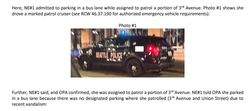 Maks told the OPA that she parked there to deter “high-dollar” vandalism at a nearby restaurant. She and other officers were assigned to an emphasis patrol as part of Mayor Bruce Harrell’s overall strategy to create a visible police presence downtown.