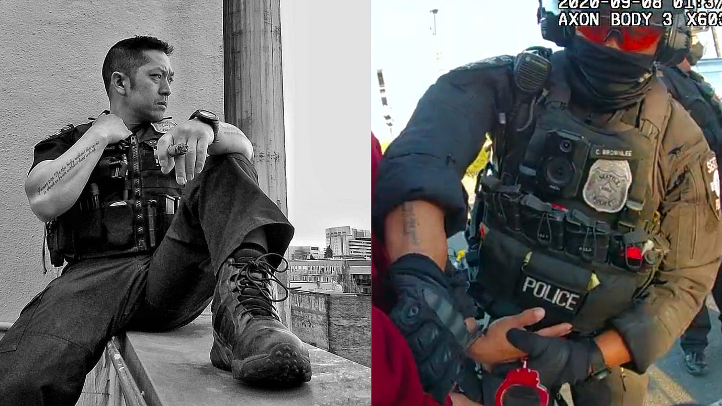 It’s a black-and-white photo of Brownlee in his SPD-issued vest. If you zoom in on this hi-def image, you can see the letters “-LEE” on his nametag, partially obscured by his hand. He has a Bible verse tattooed across both of his forearms, which can be seen in this still we pulled from BWV of Brownlee at the SPOG Labor Day demo: