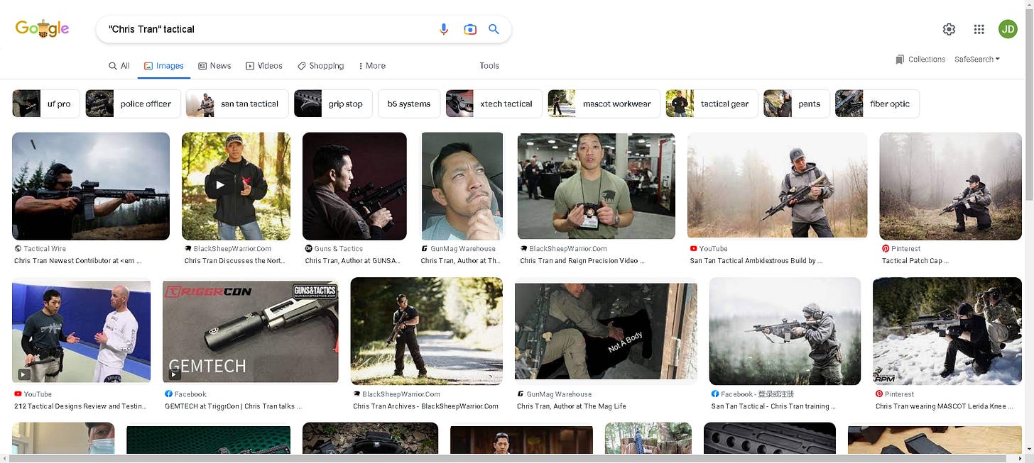 If you search “Chris Tran tactical” in Google, you get his Insta and articles he wrote in several blogs. Click the “image” tab, and you will see multiple clear front-facing photos of Brownlee.